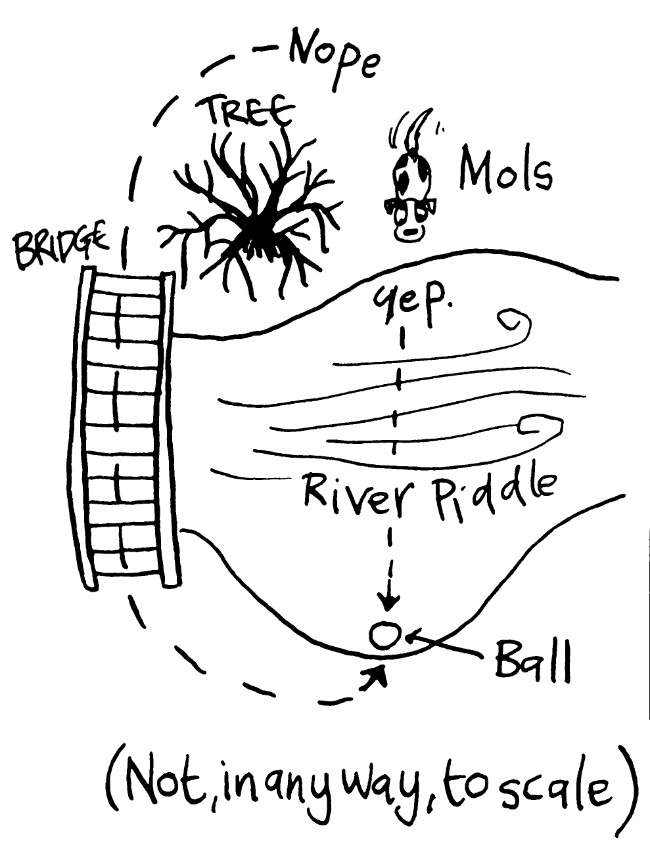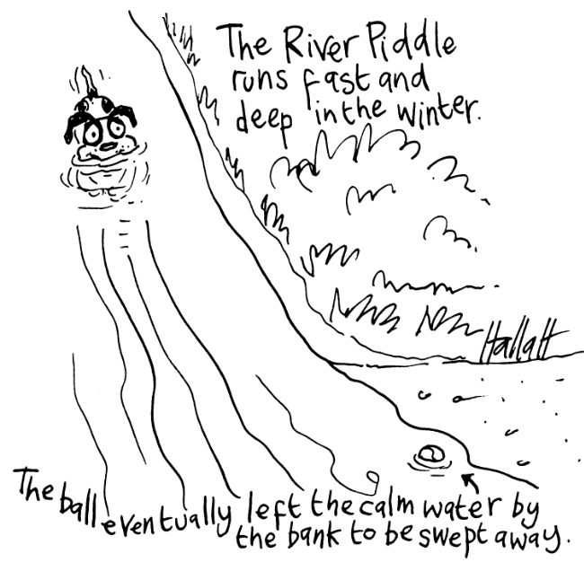I had to take off my trousers and wade out and get her. Served me right. I shouldn’t have thrown the ball for her, which she loves more than anything and will cross a raging Piddle for.
